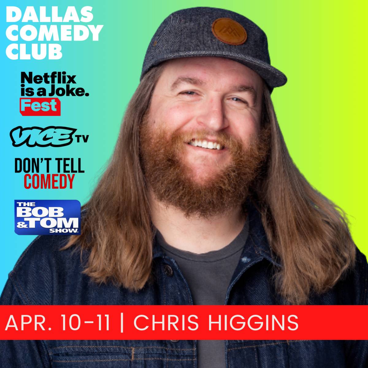ts Share Close Chris Higgins 9:30PM Chris Higgins Date Friday April 10, 2026 Time Doors 9:00pm Showtime 9:30pm Location Mainstage Theater | Dallas Comedy Club ( map ) 3036 Elm Street Dallas Dallas TX 75226 Share Buy Tickets You've seen him on ViceTV, Don't Tell Comedy & more! Chris Higgins is a nationally touring comedian from Colorado, now based in Chicago, who brings a unique blend of stoner wisdom, masterful impressions, and outdoorsy sensibilities to stages across the country.